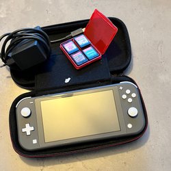 Säljer min Nintendo Switch Lite med tillbehör eftersom den används väldigt lite. Vänstra joysticken kan ha en liten drift, men det brukar släppa och fungera normalt om man rengör runt den, till exempel med en tops.