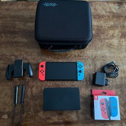 Nintendo Switch konsol med diverse tilbehør. Inkluderer dock, joy-con grip, cover, etui, holder og SD kort.