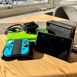 Nintendo Switch konsol med Joy-Cons i neonblått och neonrött. Konsolen är i väldigt fint skick, då skärmskydd använts sen dag 1. Levereras fabriksåterställd med dockningsstation, Joy-Con-grepp och strömadapter. Original förpackning medföljer inte.