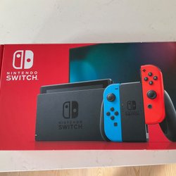 Nintendo Switch-konsol med Joy-Con-kontroller i neonrött och neonblått, dockningsstation, Joy-Con-grepp, handledsremmar för Joy-Con, HDMI-kabel och strömadapter i originalkartong. Micro-sim kort från Samsung medföljer också, se bild.