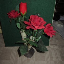Ett vackert arrangemang med konstgjorda rosor placerade i en fyrkantig glasvas. Perfekt som dekoration i hemmet eller på kontoret. Rosorna har en djup, mörkröd färg som ger en elegant touch.