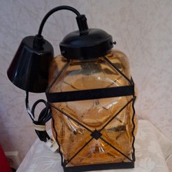 En retro taklampa i bärnstensfärgat glas med ett svart dekorativt mönster. Lampan har en fin lamphållare i mässing. Gissar på 60-tal. Norsk eller dansk.