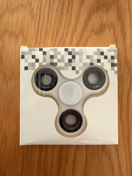 En fidget spinner i sin originalförpackning. Perfekt för den som behöver något att pyssla med.