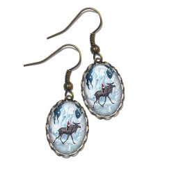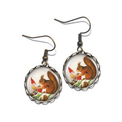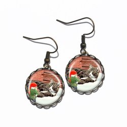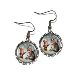 Snygga handgjorda örhängen föreställande en tomte och en katt. Motiven skyddas av klara, kupolformade glascabochoner som framhäver färgerna och ger ett vackert djup.