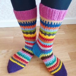 Ett par handstickade sockor i olika ljusa nyanser med ett mönster av ränder. Sockorna passar storlek 37 och har kort mudd. Obs. Inte gjorda av mig. Aningen missfärgade vid tårna.