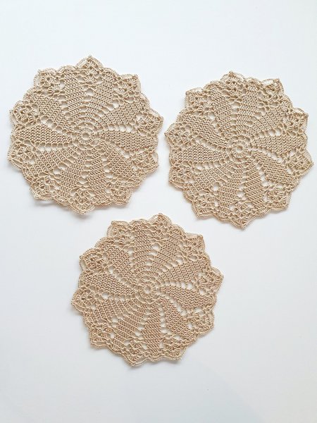 Tre st beiga handgjorda virkade dukar, ca 23 cm i diameter. De är virkade i bomullsgarn.