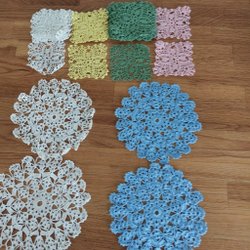 Tre stycken fint virkade dukar i tunt, vitt garn och blommor i två nyanser av rött. Gröna "blad"