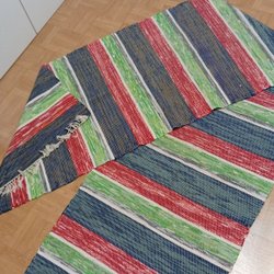 En trasmatta i varierande färger. Mattans längd är 131x61 cm.sliten i ena kanten går säkert att laga för den händige