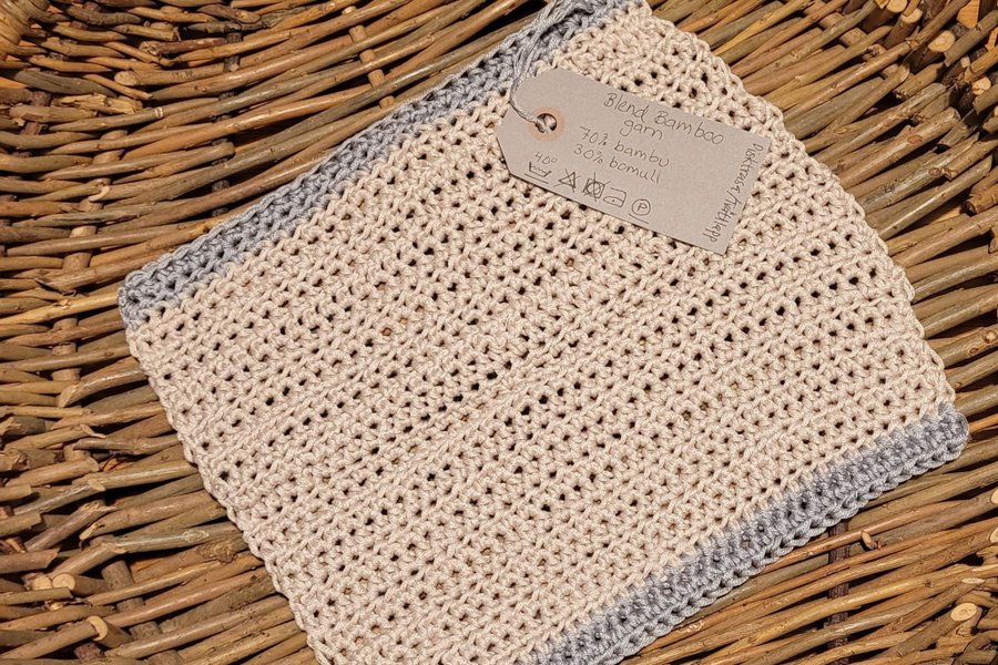 Hand virkad disktrasa i Blend Bamboo garn. Material: 70% bambu, 30% bomull. Tvättas i 40 grader står på garnet.