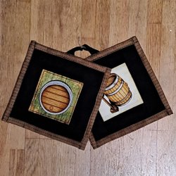 Två grytlappar med röd kant.