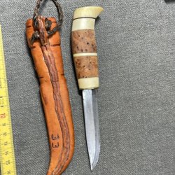 Samekniv. Knivbladet är märkt med initialerna "RB". Skaftet är tillverkat av material som masurbjörk och renhorn. Knivslidan är gjord av läder.