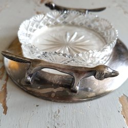 Två smörtaxar på en nysilverbricka. Smörskål i pressat glas.