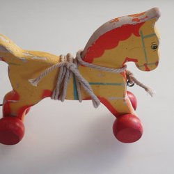 Trähäst dragleksak på hjul
