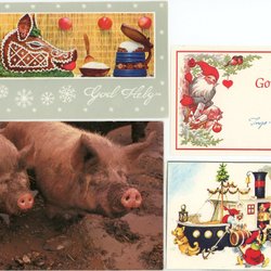 3 olika Julvykort med grisar och 4 mindre julkort med tomtar o grisar
