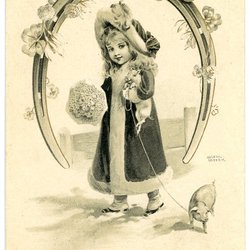 Äldre sign vykort med Flicka som promenerar med gris