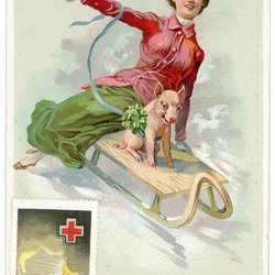 Äldre Vykort i relief tryck med flicka o gris på kälke
