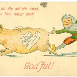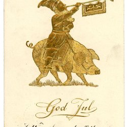 äldre God Jul Kort Med Tomte som rider på gris i guld relief