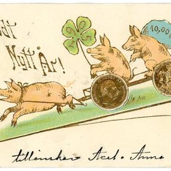 Gammalt vykort med grisar och mynt i guld relief tryck