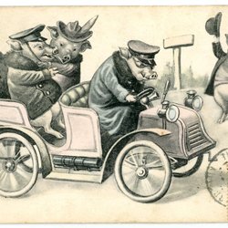 Trevligt fantasi vykort med Grisar som åker bil postad i Frankrike ca 1906
