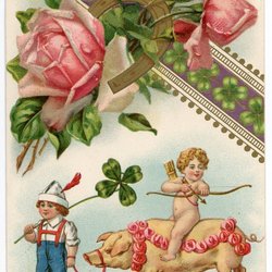 Vackert vykort med blomster o ängel på gris i guld tryck