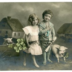 Vackert Vykort med barn o grisar
