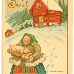 Äldre Sign A.Bäckman Julkort Gumma bär gris på fat