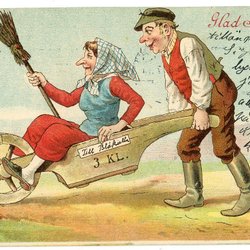 Gammalt Påskkort osign Trn med gubbe som kör påskkärring i skottkärra