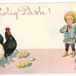 Äldre Sign Jenny Nyström Påsk vykort Pojke fotograferar tupp med familj