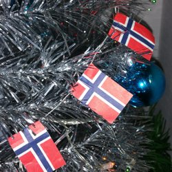 Norska flaggor på snöre. Snyggt i granen. Nostalgiskt!