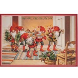 Julrad i papper med sittande tomtar.