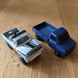 Två leksaksbilar i metall