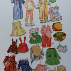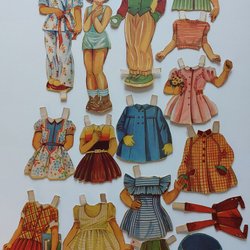 Klippdockor. Lite äldre Klippdocka med många kläder. Totalt 16 delar.