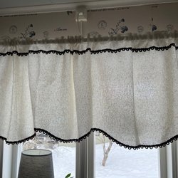 Två blå/grå gardinkappor med spets.