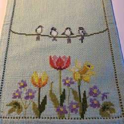 Vacker broderad påskduk fåglar påskliljor och tulpaner
