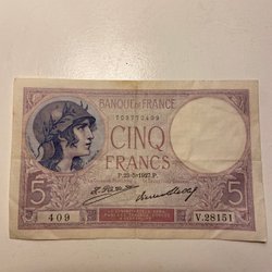 Fransk sedel 5 francs - 1927.
