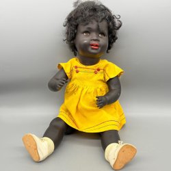 Vintage Svart Docka med Gul Klänning och Skor - Tyskland