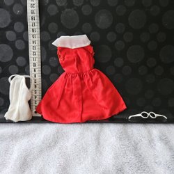 Dockkläder och tillbehör: Röd klänning, vit topp och glasögon