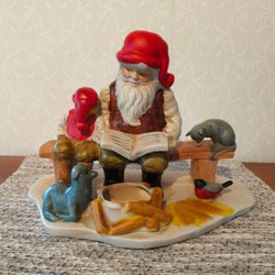Caroline Grinda Christensen Jul Tomte som läser för Barn och Katt på Bänk