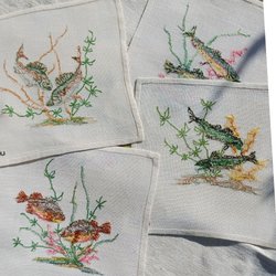 4 Broderade mellanlägg med Fiskmotiv samt 1 med en våg.