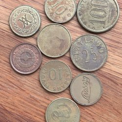 Skultuna Mejeri polletter, en med stansad 4:a