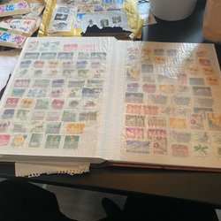 Frimärksalbum med tusentals lösa osorterade frimärken