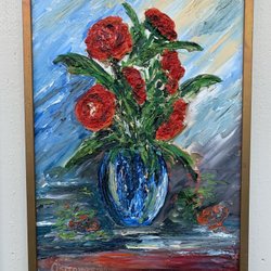 Blomstermålning signerad Osborne 1976 rikligt med färg
