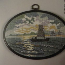 Komplett broderi, tavla med segelbåtar till havs