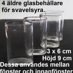 4 äldre behållare för svavelsyra till innanfönster.