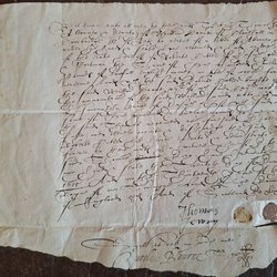 Manuskript på papper. Cutler köper mark av Crane för 112 pund. Cambridge. 1615