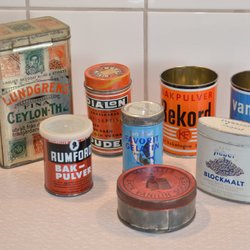 Parti älder plåtburkar Rumford Mazetti Dialon Favorit Kooperativet Retro