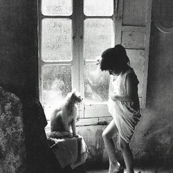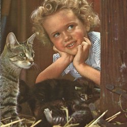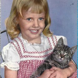 Flicka med kort lugg och kattunge, postat på -60 talet.