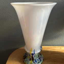 Vintage handblåst opalinvas – konstglas med färgad glasfot – retro 80/90-tal