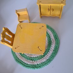 Dockskåps möbel i trä bord, stol skåp och matta