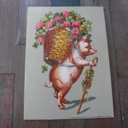 Ett vykort 15 x 21 cm med en gris med blomsterkorg